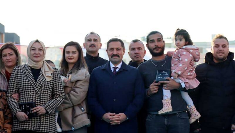 Törene canlı bağlantı yapılan Antakya ilçesi Dikmece Mahallesi’ndeki programa katılan Vali Masatlı, Merve ve Ahmet Aydın çiftine evlerinin anahtarını teslim etti.